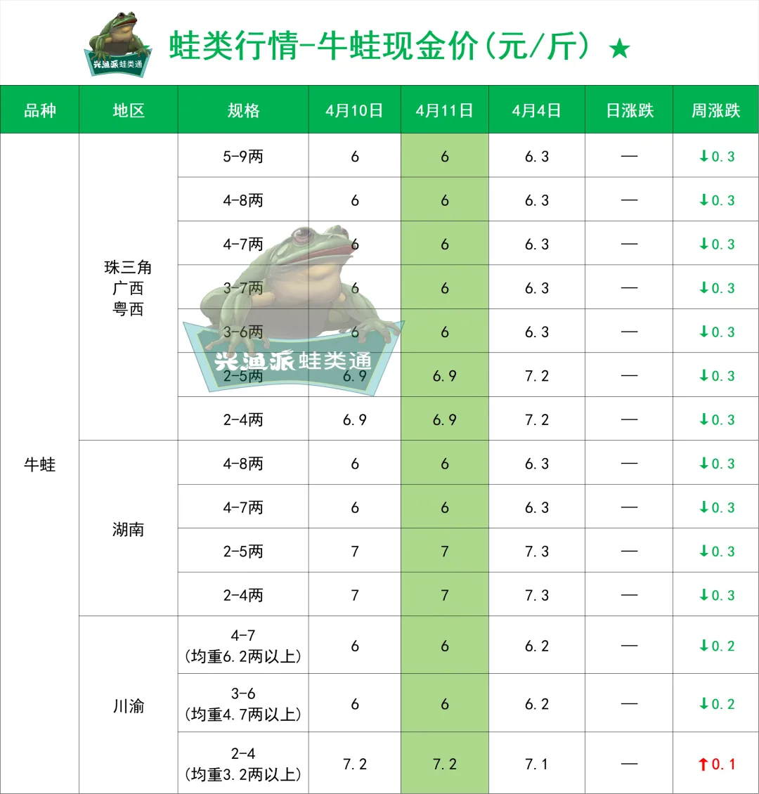 4月11日全国牛蛙、黑斑蛙、泰蛙最新行情