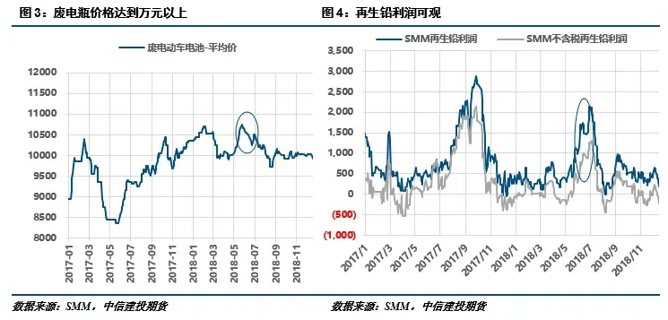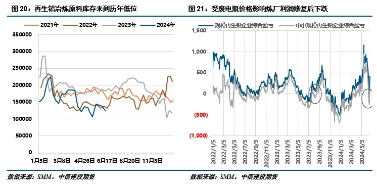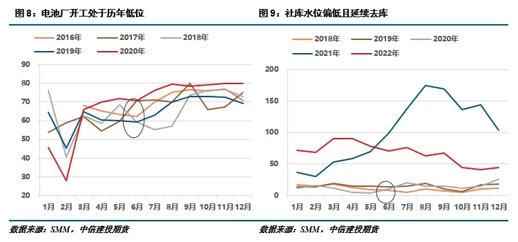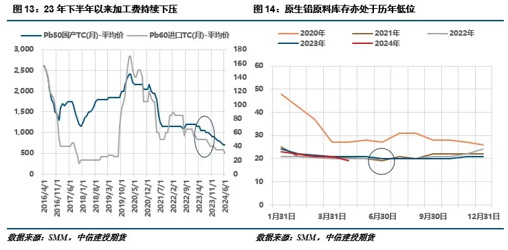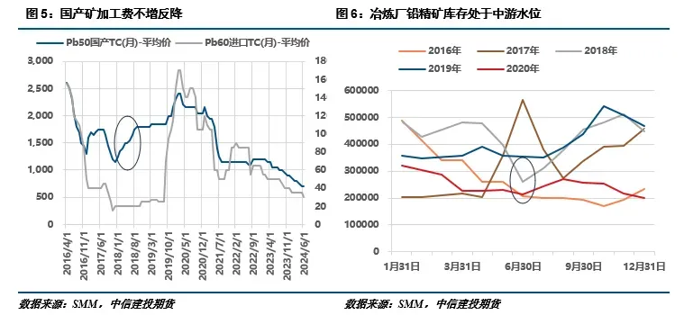 1.成本端并无支撑:1)废电瓶价格虽高居万元以上但并未对铅价形成成本支撑,因为彼时再生铅厂利润高企,6月再生铅利润尚有1000-2000元,炼厂并无减产意愿;2)铅精矿供应相对充足,炼厂原料库存处于历年中游水位;亦可由加工费得到印证,彼时进口加工费虽延续低位,但国产矿加工费不降反增。