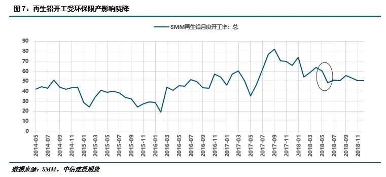 2.供应端缩量明显:接连受到环保检查消息影响,河南及安徽地区再生铅厂开工过低,6月5日行情开启前环保督察“回头看”正式启动,此外亦有消息称6月18日起在河北全省开展企业排查整治“雷霆2018”专项行动受整治行动,6月开工率环比5月骤减近10%。