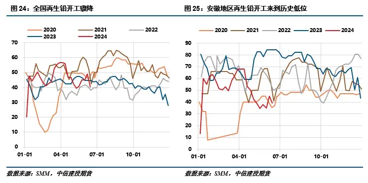 复盘I:2018.06,由环保限产消息面情绪刺激带动,成本端并未有明显抬升,在供应端减产预期被证伪后下游偏低开工也难以给铅价提供过多支撑;值得一提的是,在6月交割后铅锭低位下延续去库却未被用于炒作题材,可见消费端定价权重颇高。复盘II:2023.09,与如今逻辑颇有相似,终端消费乏力的情境下实际需求兑现不及预期,铅价主要依靠原料紧缺提振,炼厂端减产的同时成本抬升铅价重心。不过下游开工并未像如今般高企,而是身处5年低位,铅锭也因此在价格拉升过程中快速累库,二次重心上移后资金开始退潮,高库存压力凸显,铅价快速承压回落。