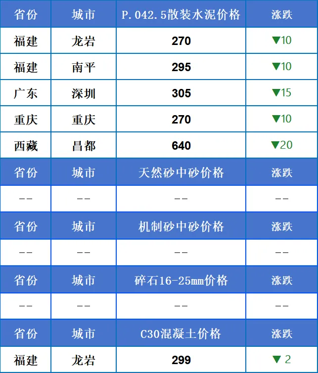4月9日全国水泥行情小范围下跌,龙岩、南平、深圳、重庆、昌都跌10-20元/吨。