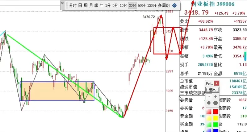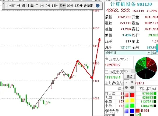今日走强后转入震荡,回调后同样值得保持关注。CPO方向连续三日上涨,30分钟级别需等待回调确认,切忌追高。