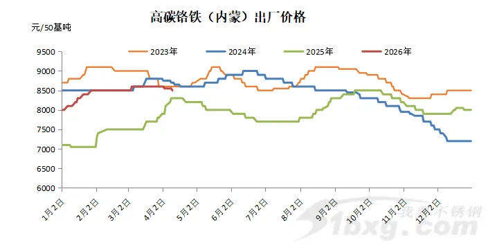 今日,高铬主流出厂报价下跌50元/50基吨,至8500-8600元/50基吨上下。4月份以来,高铬零售价格已累计下跌100元/50基吨,跌幅1.16%。