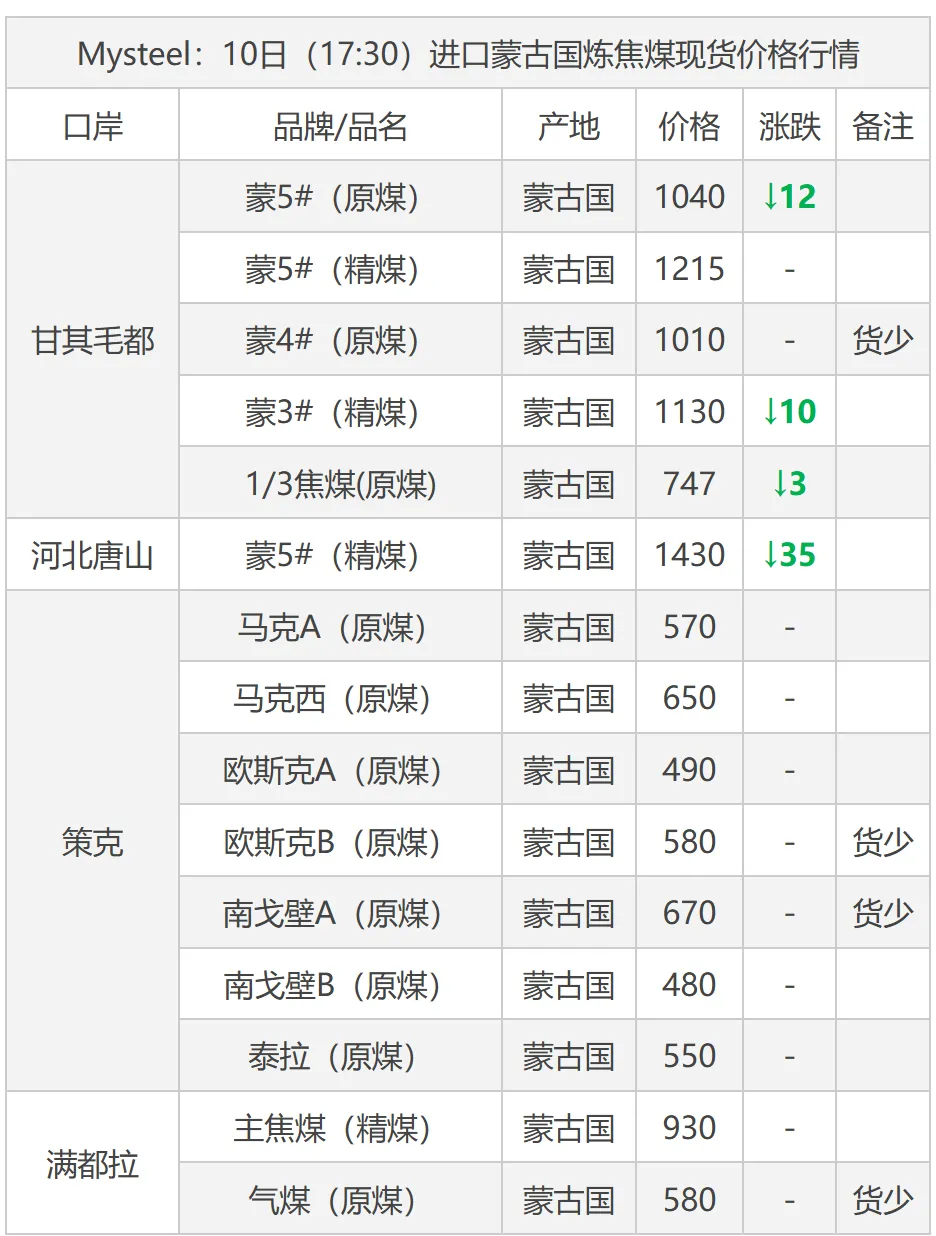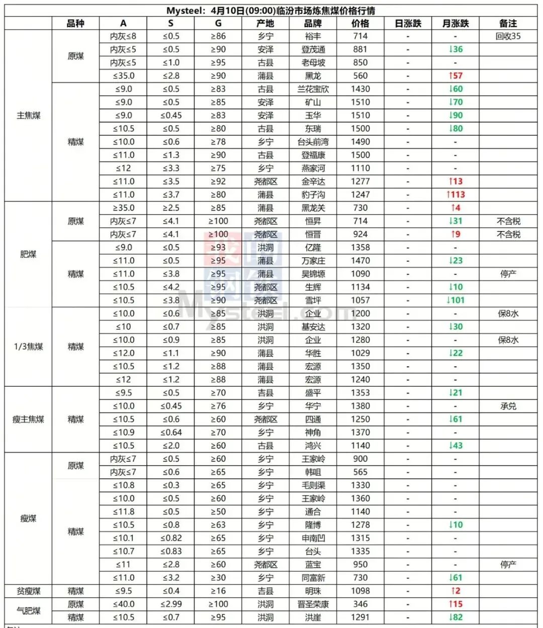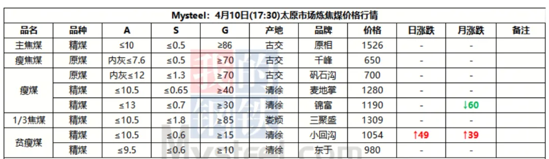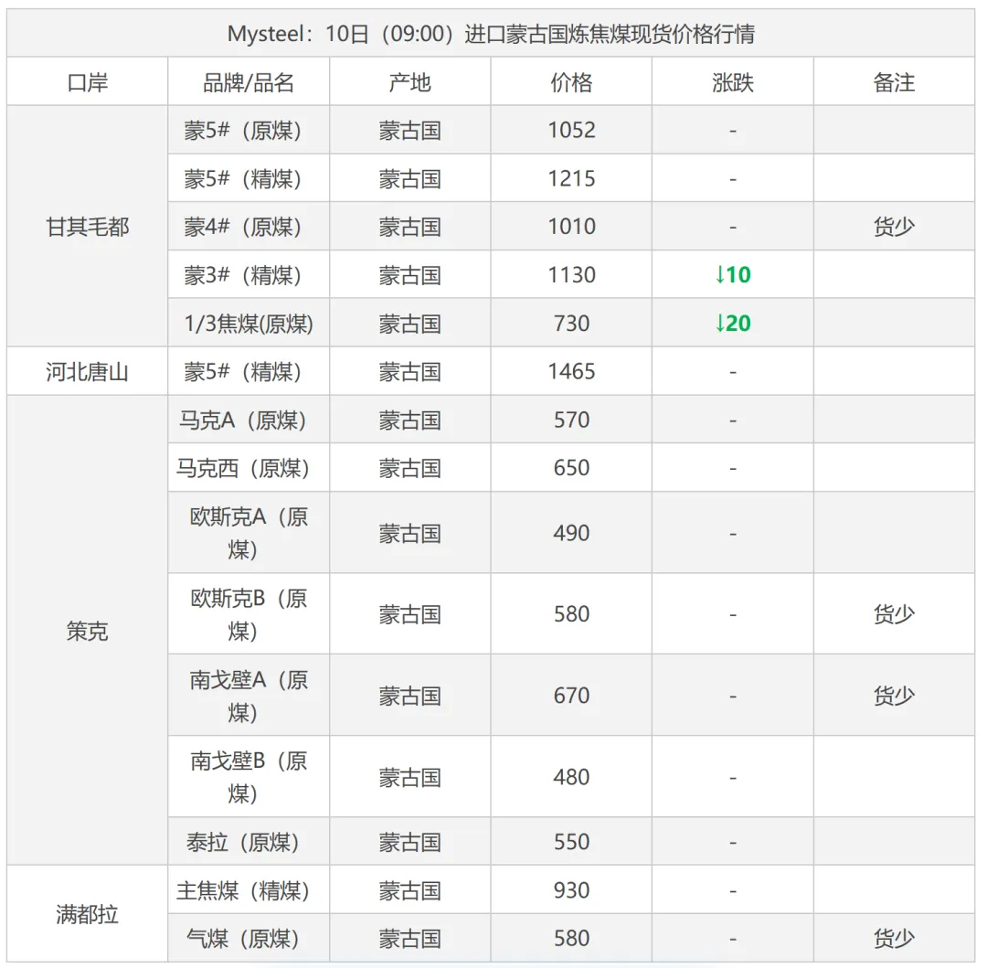 10日临汾市场炼焦煤价格暂稳运行。区域内煤矿生产总体上基本正常,本周原煤产量较上期基本持平; 昨日内蒙地区个别焦企对焦炭价格提出第二轮上涨,主流焦钢企业暂未回应,由于成本支撑减弱,焦企在仍有利润的情况下维持高稳开工,后续仍需关注焦企利润边际及钢材价格走势等的改善情况。综合来看,预计短期内临汾市场炼焦煤价格将震荡运行。
