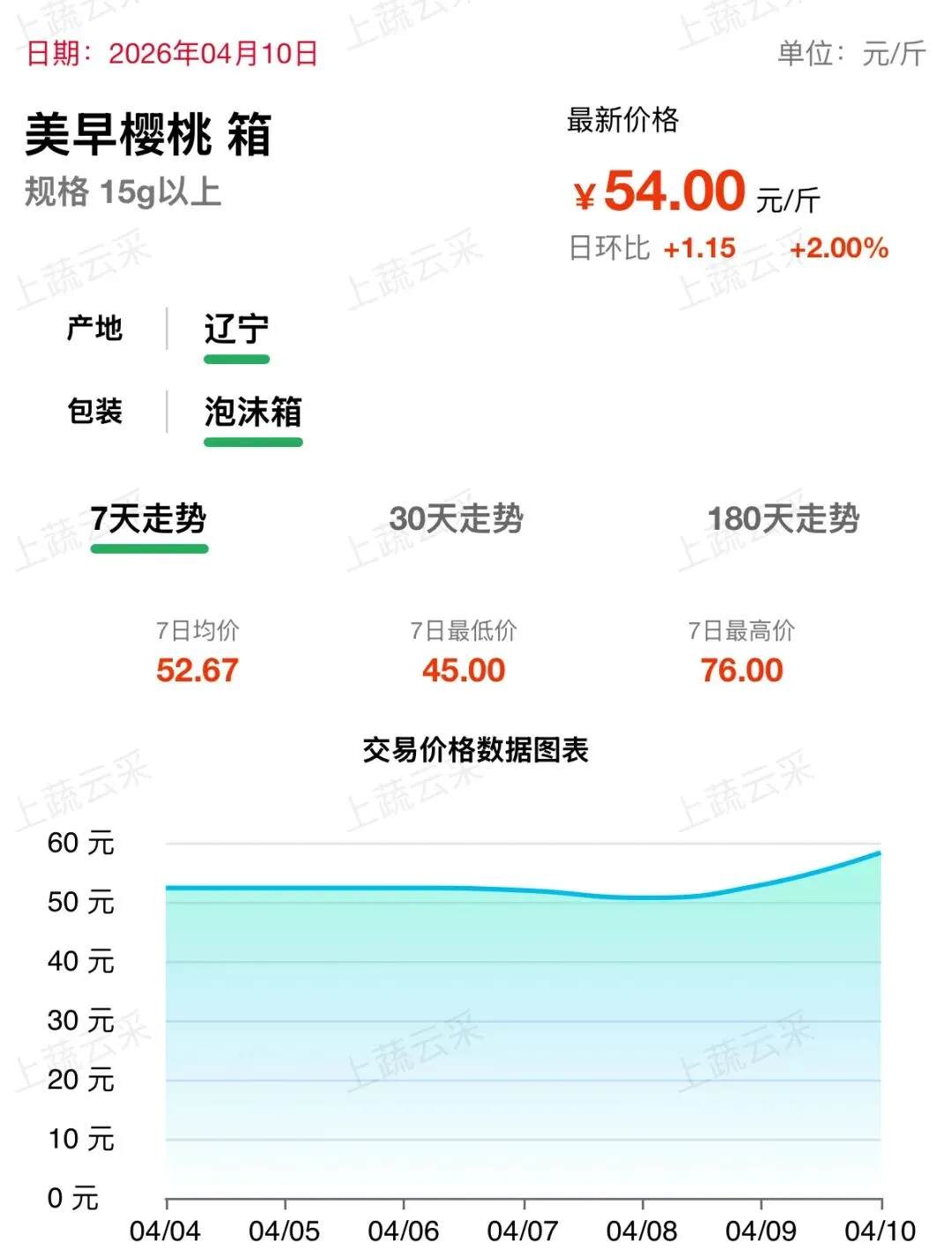 大连美早樱桃(单果15g以上)价格约54元/斤。