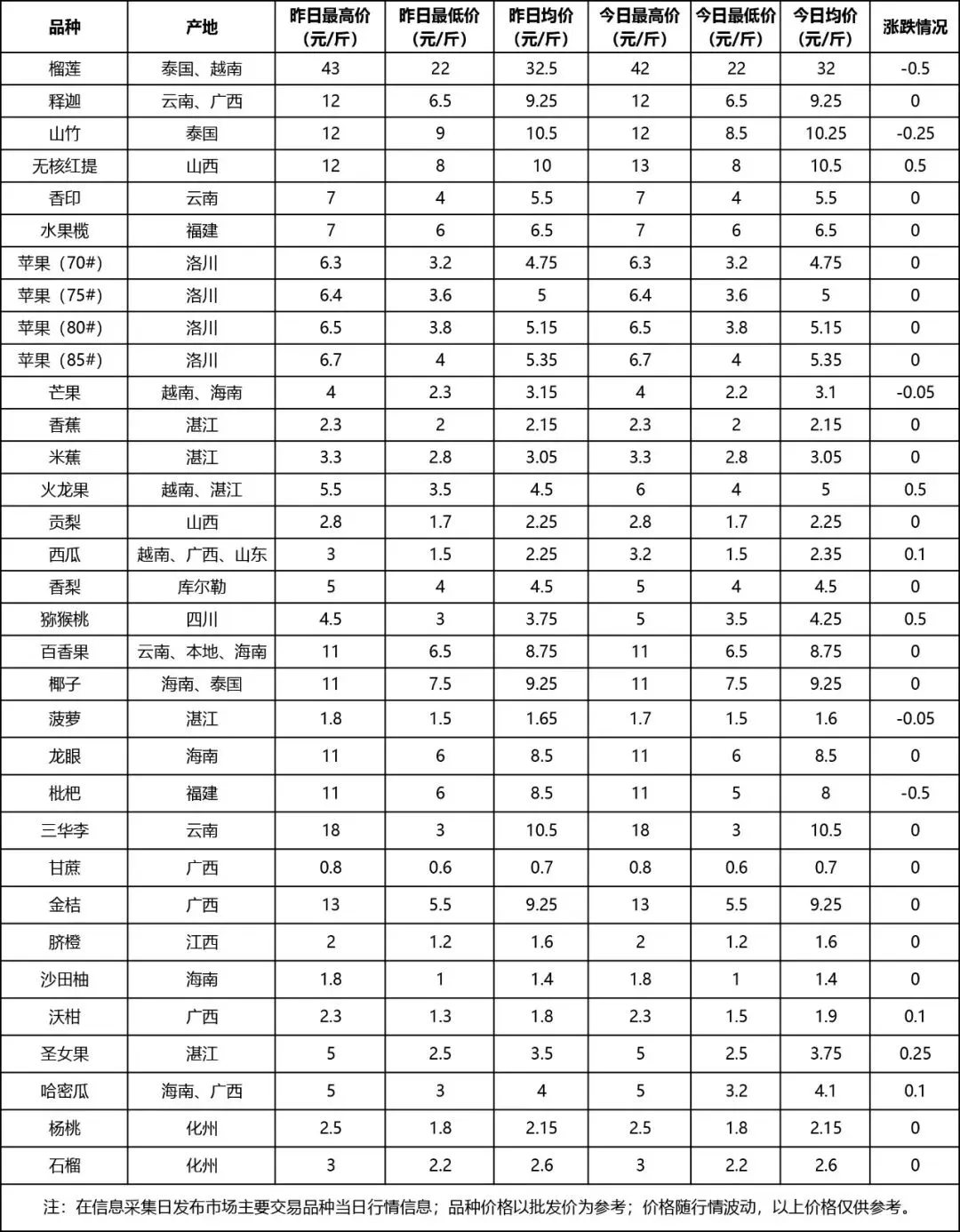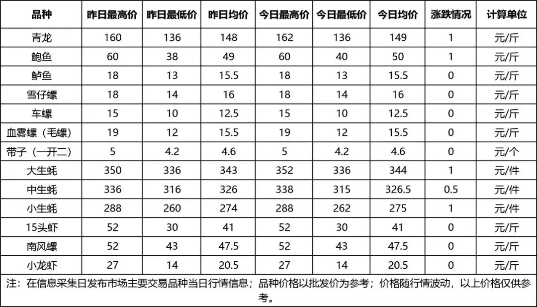 粤西农批每周三、五定期发布市场主要交易品种当日行情信息;品种价格以批发价位参考;价格随行情波动,以下价格仅供参考,以实际购买价格为准。以下是4月9日-4月10日监测品种行情信息,其中水果、蔬菜为4月9日报价,海鲜为4月10日报价。