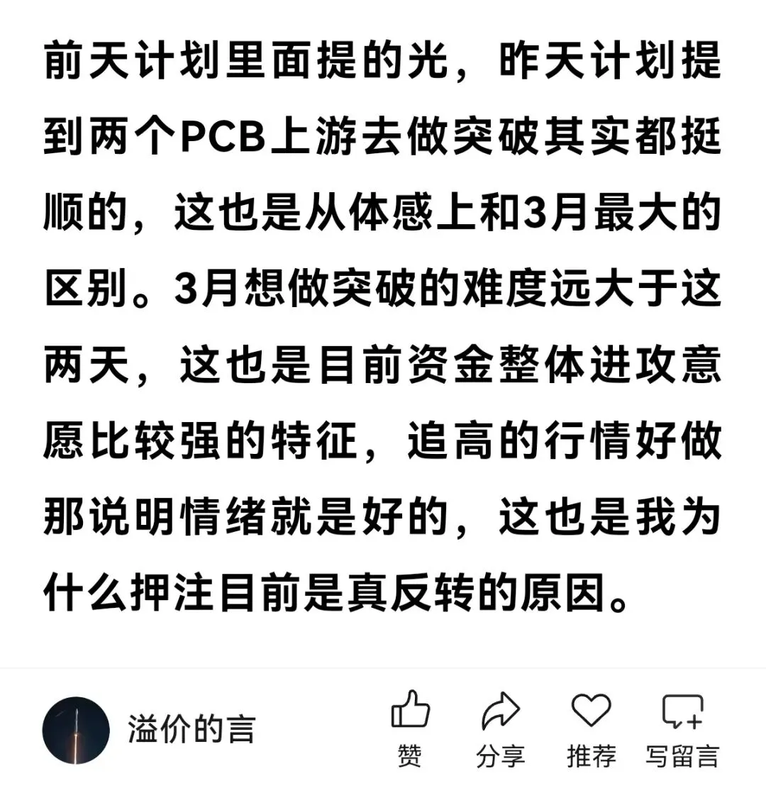 今天创指突破延续反转,都是在预期之内了。计划里面的内容我就不做回顾了,你们持续有领的都清楚,无论是中线的光还是短线的PCB,每一步都踩在节奏上了,我觉得复盘里观点、题材、位置都给的那么明确的不会有多少个的。