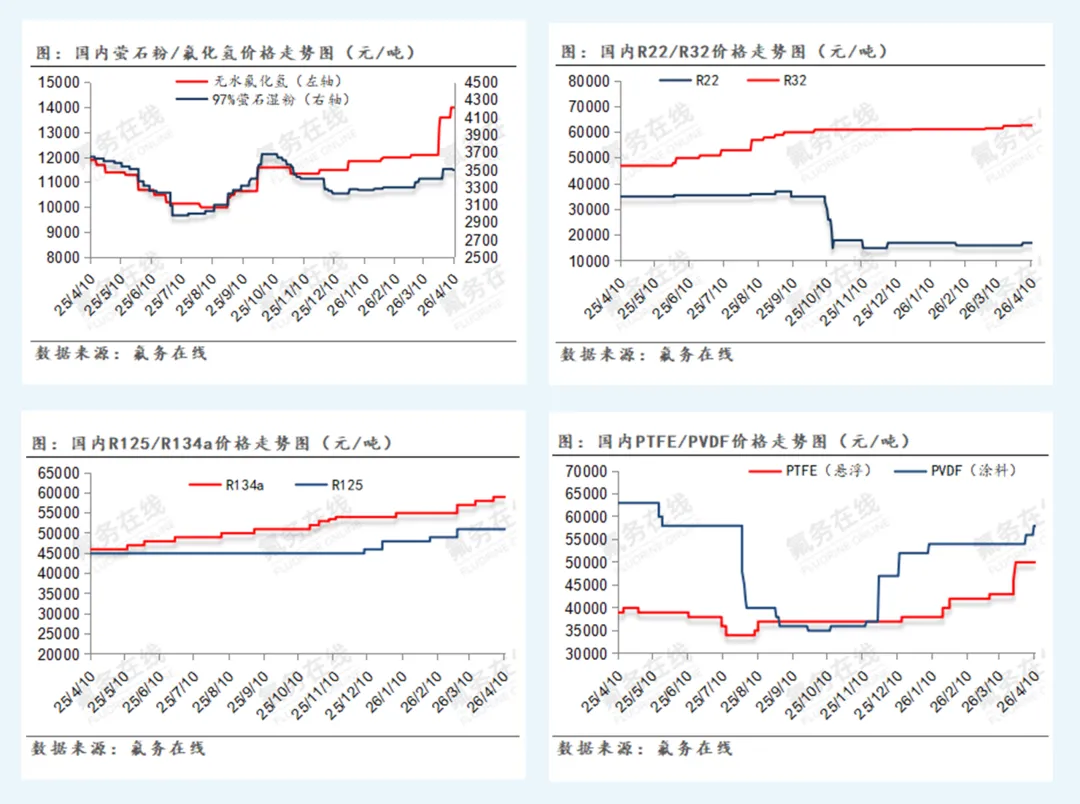 PTFE市场短期维稳态势。成本端支撑持续增强,市场氛围向好;但供应放量叠加下游需求跟进速度不及价格涨幅,行情上行空间受限。刚需补库结束后,短期市场以稳为主,企业将根据成本波动灵活调价。在成本有力支撑下,后市预计呈温和上行趋势。主流报价参考:悬浮中粒5.0-5.2万元/吨,悬浮细粉5.1-5.3万元/吨,分散树脂5.0-5.4万元/吨,分散乳液3.0-3.2万元/吨。PVDF市场行情持续回暖,受成本压力驱动,企业纷纷上调报价,部分厂家已发布涨价函,各牌号价格普遍走高,实际成交仍依赖下游供需博弈。上游原料涨价为企业挺价提供支撑,报价上调带动市场整体上移,散单及各牌号成交价震荡上行,市场向好趋势明确。其中涂料级、制品级价格波动显著,成交重心同步抬升;锂电级受储能需求释放偏缓、下游行业运行周期影响,涨价空间相对有限,但后市仍具备稳步上行潜力。主流报价参考:涂料级5.8-6.2万元/吨,制品级6.0-6.3万元/吨,锂电级5.7-6.5万元/吨。