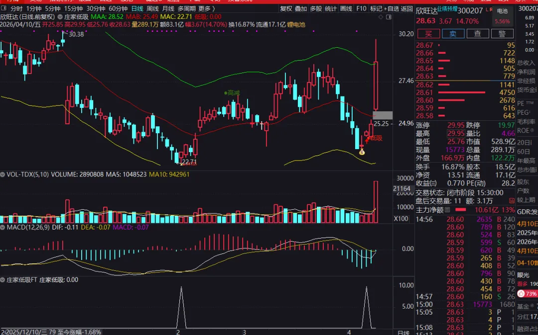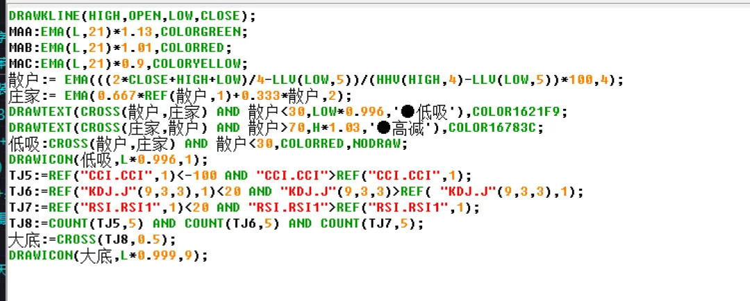 宝子们!新来的小伙伴一定要点个关注呀~ 每次看到后台又多了一个小小的头像,心里都像被暖光烘着一样甜。你们每一条留言、每一个点赞,我都会反复看好多遍,像收藏小宝藏一样存进心里。这个号能慢慢走到现在,全靠你们一点点的支持和陪伴,真的特别特别珍惜这份缘分~ 以后也想一直在这里,和你们分享更多有意思的事儿,做你们互联网上的好朋友呀!指标是一个综合性的抄底与逃顶系统,主要用于捕捉股价在超跌后的反转机会。它通过结合价格通道、多空力量对比以及多种经典超卖信号来综合判断。当代表散户的指标线从下方穿过代表庄家的指标线,且整体处于低位时,会发出“●低吸”信号。同时,当多个常用技术指标(如CCI、KDJ、RSI)同时显示超卖并开始反转时,会触发“大底”信号,提示可能出现重要的阶段性底部。