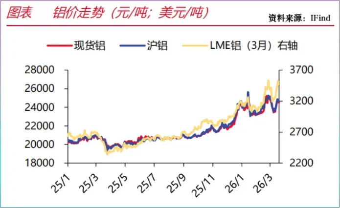 截至2026年4月3日,国内现货铝价24505元/吨,较2025年底一吨上涨约2000元,仅3月电解铝单月同比涨幅已达116.61%。