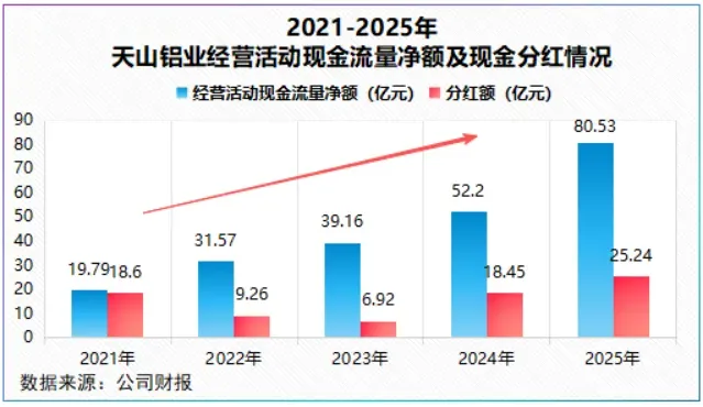 得益于极致控本,2025年公司经营活动现金流量净额达80.53亿元,五年年均复合增速42.03%,这给了天山铝业大手笔分红的底气。