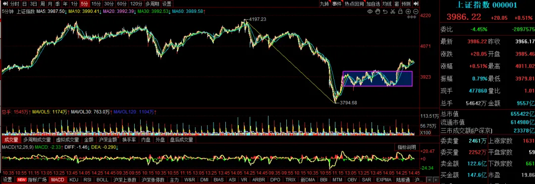上证5分钟走势结构:看一下5分钟,我们一直说这个位置可以走个30分钟运动。先看5分钟的生长,那我们看昨天说3950这个地方是形成三买的,所以今天直接延续昨天的这个尾盘的上涨,形成了三买的延续。目前这个位置明显是出新高不出新低的走势。说明下周初最多低开,就可能上去。这位置只要在3950的上方构筑,那么结构越简单,实际上我们看到的这是一种强势表达,所以说还是可以延续上涨。