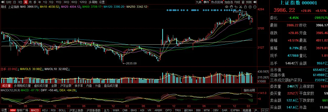 今日沪深两市成交2.32万亿,成交量较上一交易日放量1888亿。两市实际上涨3709家,实际下跌1362家,实际涨停59家,实际跌停8家。主流资金今日净买入14.58亿元,下图是今日资金进攻的板块路径今日市场一改昨日缩量滞涨颓势,全天呈现价升量增行情,其中创业板指领先全球市场率先创出阶段新高,沪指盘中也一度收复4000点整数关。不过从涨停家数看,相比昨日增长相对有限。从领涨的创业板指来看,今日其大涨125点中,前三大权重股宁德时代、中际旭创、新易盛合计涨超100点,占据其中的八成,可见大市值权重股的波动直接左右所属指数表现。从沪指方面看,今日冲高回落收出带长上影的小阳线,虽然上方30日线和半年线压力沉重,但下方5、10日均线若能相继向上金叉20日均线,则短期反弹趋势仍有望维持。而今日领涨的创业板指在短线突破日线布林上轨线的同时,KDJ指标出现高位钝化,短线冲高后震荡消化仍是大概率事件。上证周线走势结构:周线前面我们都说以四周为节律在运动,现在是第三周,这个底就成立了,其实在上周已经是底分,本周是一个缩量的阳线,这个在传统技术上是搓揉,就是选方向。那这个地方出现了一个缩量的阳线,那么缩量代表着没有分歧,也就是说在经过消化之后,市场重新选择向上,且这个向上没有分歧,后期还是有望继续的延续这一笔的。周线上没有看到顶分之前,或者小阴小阳,实际上是没有必要去恐慌的,现在是周线一笔的延续中。上证日线走势结构:这个日线在周三的这个大阳之后,形成了两天的整理,这个又是一个小搓揉线。我们能看到重心实际上是上抬的,今天也是没有太多的量,但是这两天是上涨后的调整,上涨后的调整我们能看到带量,有量,所以这个位置实际上是有承接的。承接一般说的是短线获利盘回吐,中线资金的承接。我们主要说的是中线资金,因此这个位置还是可以继续的向上看。目前实际上还是笔的延续中,连顶分都没有。