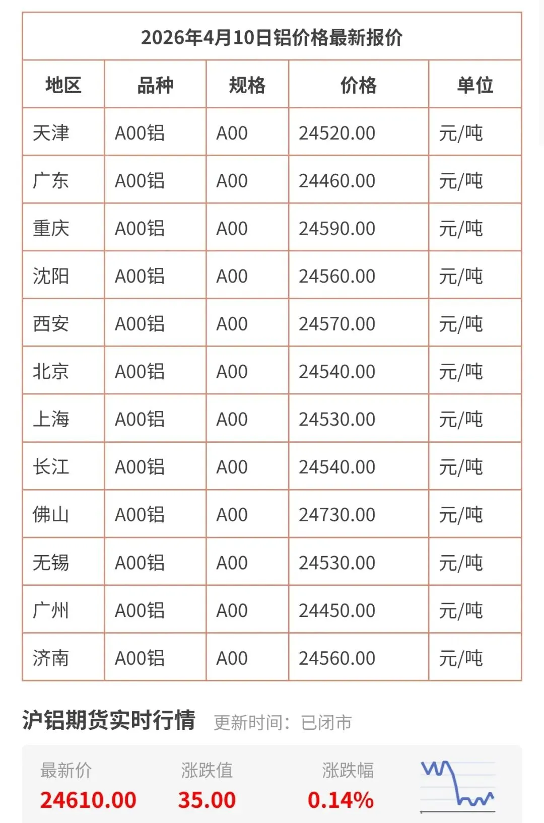 今天4月10日更新,今日铝价行情查询,包括天津、广州、上海、北京、无锡、广东、佛山等地区铝现货价格!长江有色铝锭最新价格是多少钱一公斤一览表