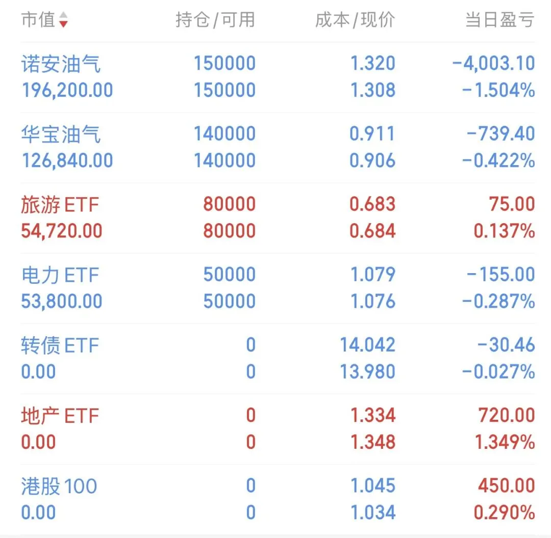 今日中证500指数上涨0.9%,账户下跌-0.84%、亏损-3680元,高位卖出了地产etf和恒指etf,买入了电力etf和旅游etf,前天的券商止盈昨天在券商和地产二选一、选了地产、结果今天券商真猛啊。2点的时候看大盘会回落、所以加仓了油气etf、结果尾盘竟然一起跌了、目前持有32万油气etf、5万旅游etf、5万电力etf、总仓位100%
