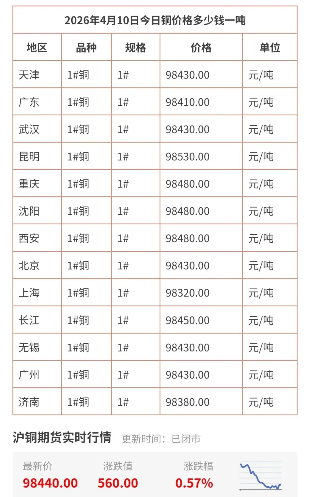 4月10日更新,今天铜价实时查询!最新今日铜价格多少钱一吨,包括广东、武汉、昆明、西安、无锡、天津等地区现货铜价格