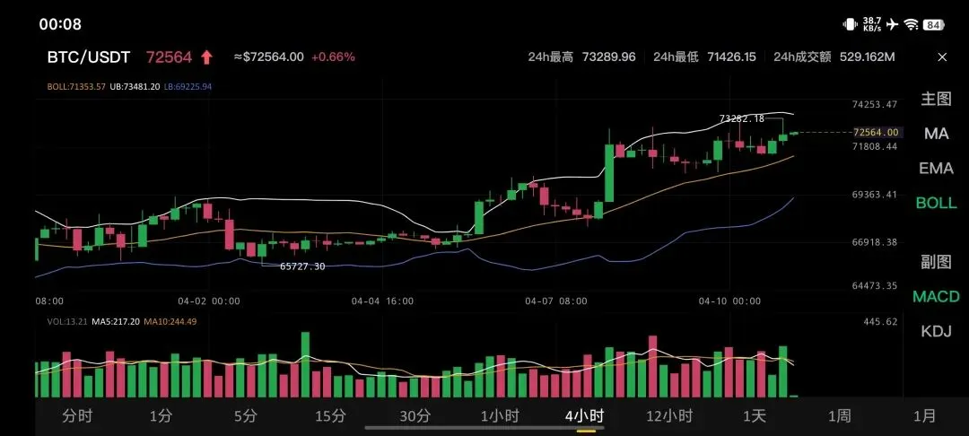 · 短期(1h-4h级别):价格处于$71,350–$73,480的窄幅震荡区间内,布林带收口暗示变盘临近。MACD温和偏多,但量能不足制约突破有效性。