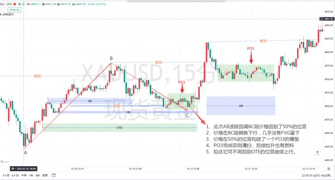 4、小级别回调,不影响大级别趋势的延续,图 1 的回调,是 1 小时图上的小级别回调,大周期的上涨趋势结构没有任何破坏。小级别的浅回调,只是大趋势里的微型缓解块,根本不需要回踩大级别的 50%/OTE。只有当大周期趋势动能减弱时,才会出现图 2 这种大级别回踩、构建 PO3 的行情。