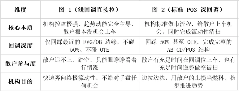 对图 2(标准 PO3 模型)的理解 100% 正确,而图 1 这种「浅回调、不回踩 50%、不回 OTE、直接暴力拉升」的行情,绝对不是机构带着散户赚钱,而是机构控盘强度拉满、趋势动能极强的典型特征,背后有一套完整的SMC底层逻辑。
