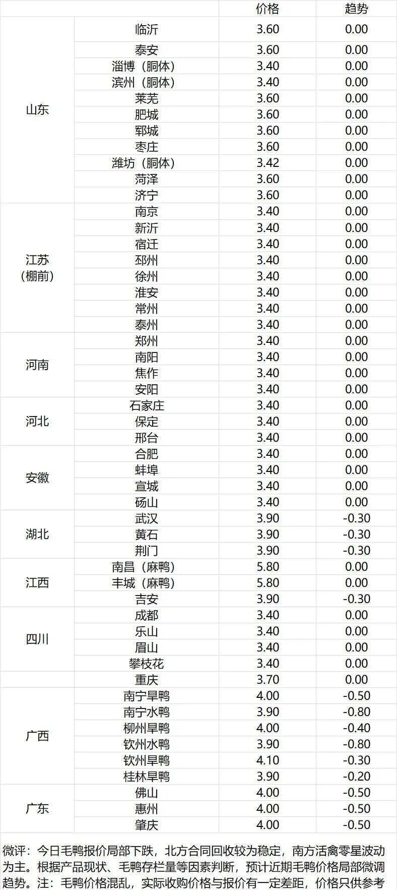 微评:鸭苗报价稳定。(注:南方只报当天价格)排苗节奏放缓,规模场补栏趋于理性。根据产品、养殖成本及鸭苗现状分析,预计近期鸭苗价格呈稳定为主趋势。种蛋报价稳定。温馨提示:该价格为主流厂家报价,实际销售价格以成交价格为准,价格仅供参考。