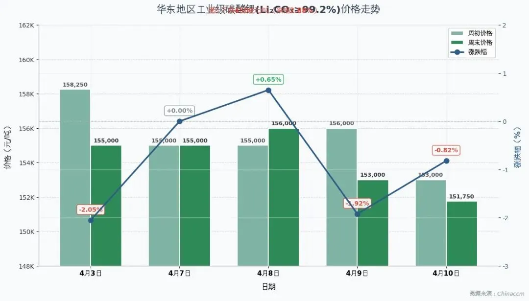 最近一周,华东地区工业级碳酸锂(Li2CO3≥99.2%)价格累计下跌3250元/吨,下跌幅度为2.10%;最近一个月,华东地区工业级碳酸锂(Li2CO3≥99.2%)价格累计下跌4500元/吨,下跌幅度为2.88%。