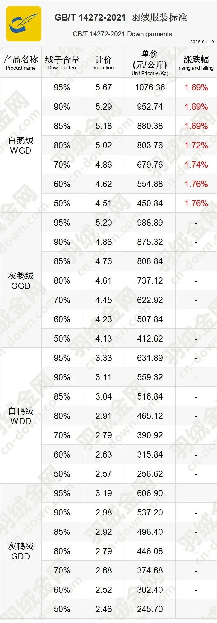 >《挥七轩》2026年4月11日羽绒价格行情