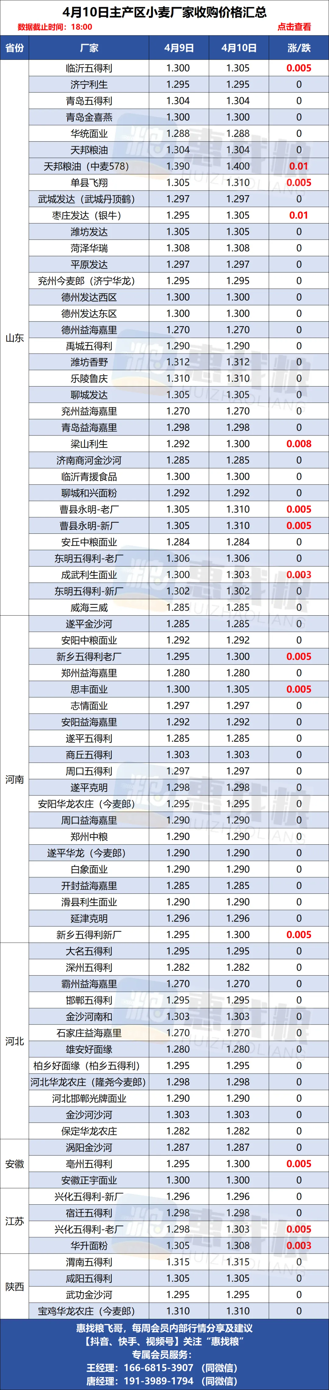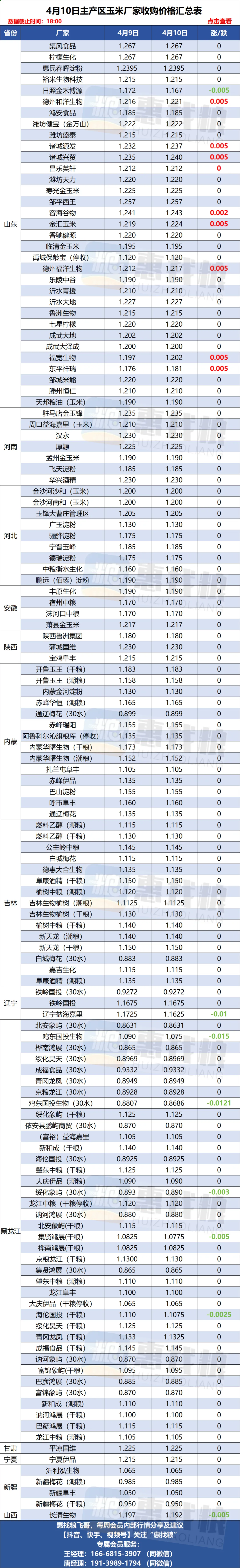 4月10日全国小麦/玉米厂家涨落行情