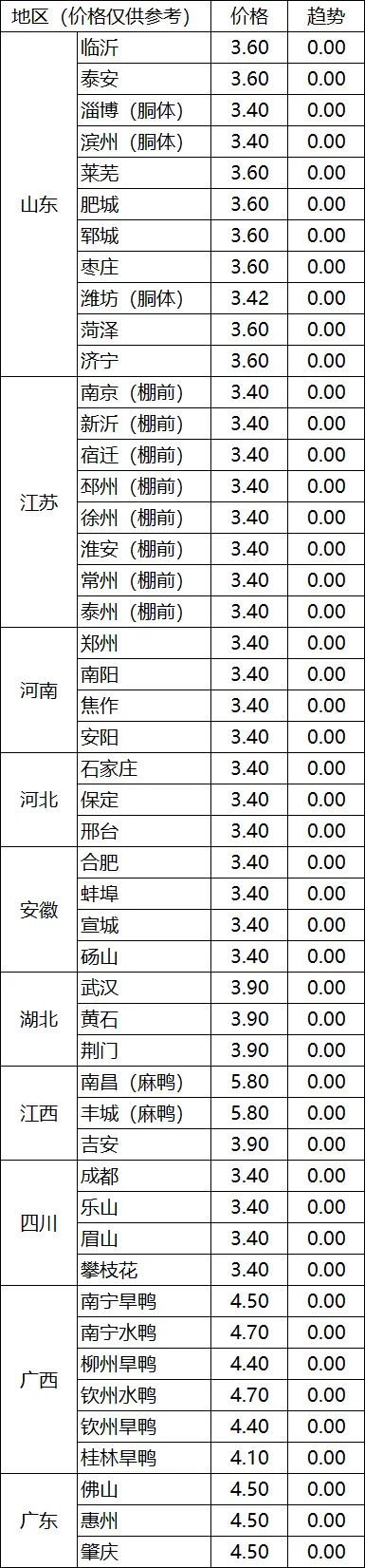泰安地区肉毛鸡棚前收购价3.50-3.60元/斤,与10日相比持平;