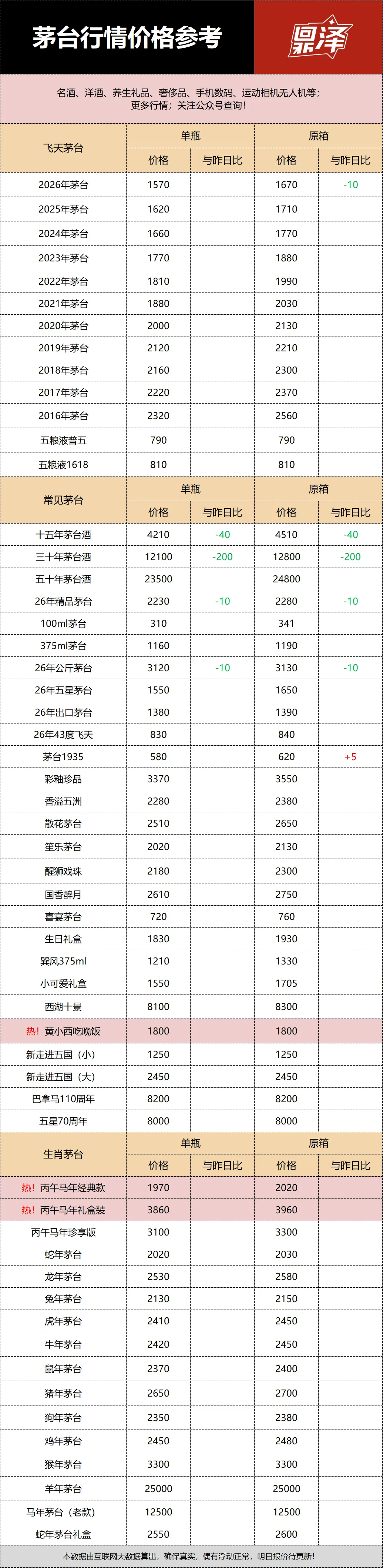 飞天茅台:2026年飞天茅台原箱行情下跌;