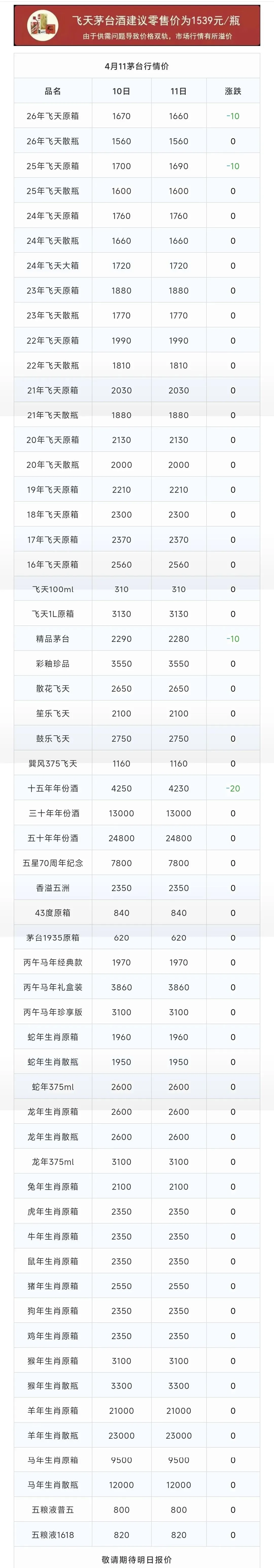 当前位置:首页>行情>飞天持续下跌!茅台酒4月11日行情价格