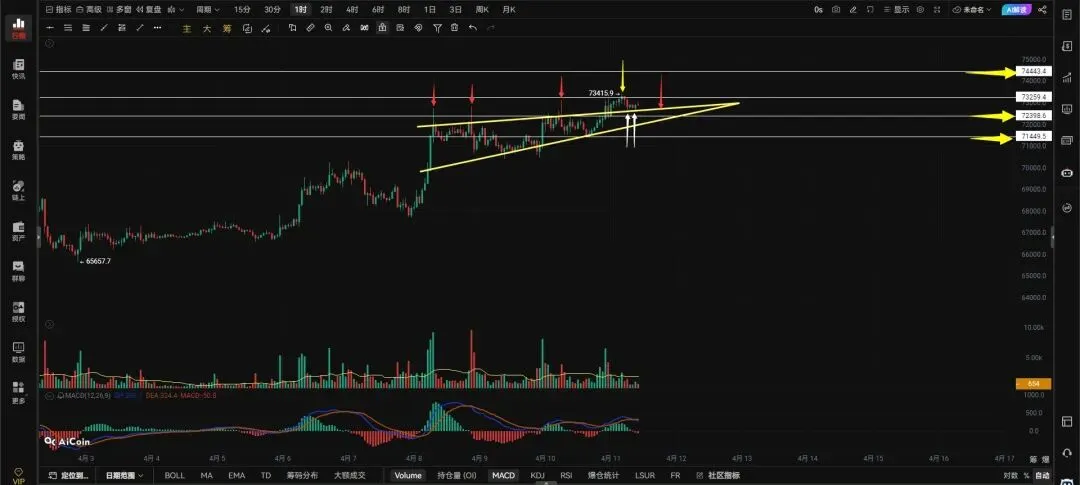 大饼再次创出新的高点,为什么每次大饼创出新的高点都只是和前高拉开很小的距离?而不是拉开一大段距离,就是因为外面不确定因素太多,再加上多头的资金也不是很充足,所以不敢大幅度的拉盘,最后导致每次创出新高都和前高相差的不远,红色箭头所指。大饼三角形被突破,突破三角形之后有两次回踩三角形上边界的动作白色箭头所指,目前就看三角形上边界能不能撑得住,能撑得住在突破前高74443就来了。撑不住重新跌回三角形内部运行,只要能保持在三角形内部走盘整啥事没有,一旦跌破三角形就要去回踩下方的71449的支撑和70486这个位置,无论大饼怎么回踩不跌破70486就不会扩大跌幅,当下大饼小时级别高低点全部都在抬高,在没有出现更低的低点之前不做去做空,尽量以回踩做多为主,不要为了去捡一个芝麻丢了西瓜。