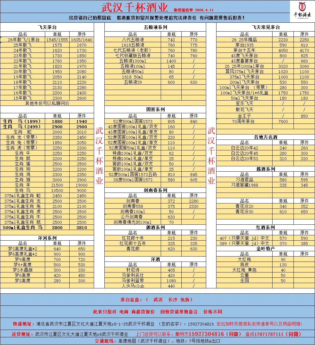 1、本行情价格为各品类酒的市场回收价格,查查收货线报以北京、上海、广州、深圳、贵阳、成都、武汉等7城市的主要酒行当天的报价来计算全国综合平均数据。实际成交价格每个城市会有差异。