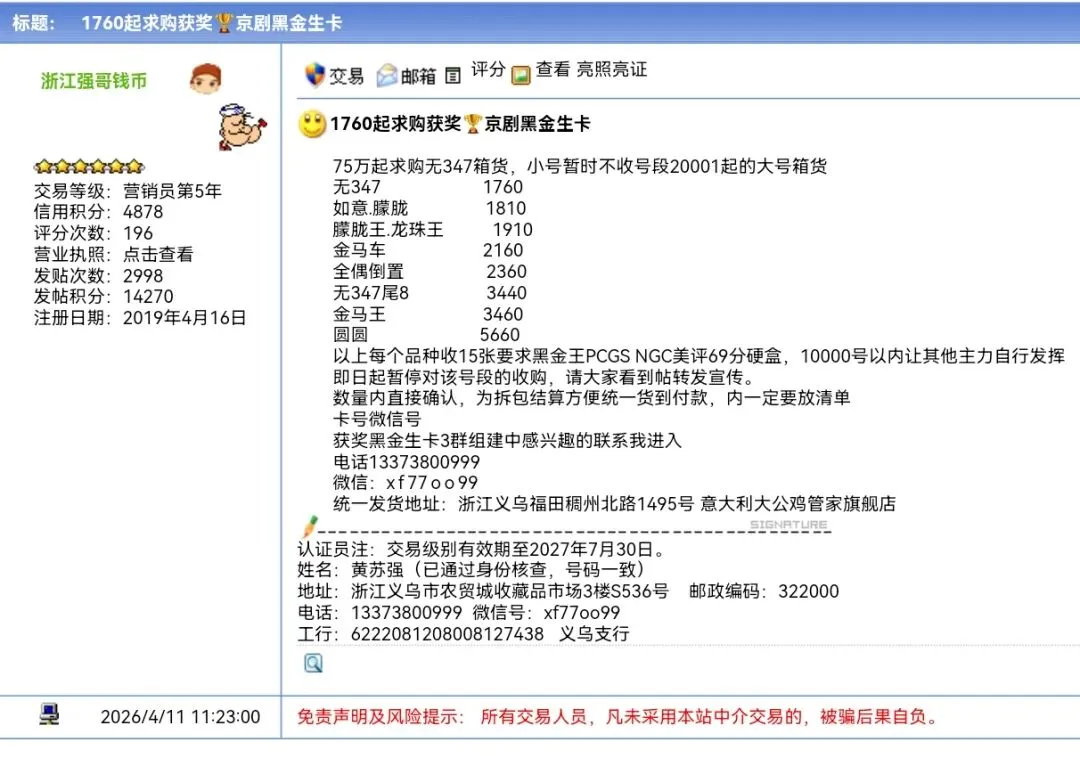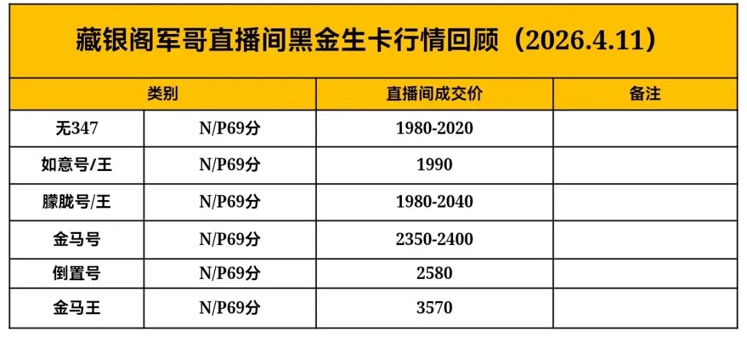 >2026年4月11日获奖纪念黑金生卡行情播报
