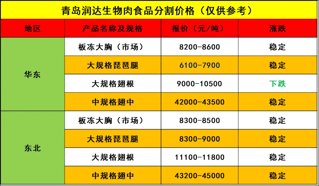 【肉鸡分割品价格行情:价格稳定为主,个别稍降,部分成交议价】润达生物2026.04.12