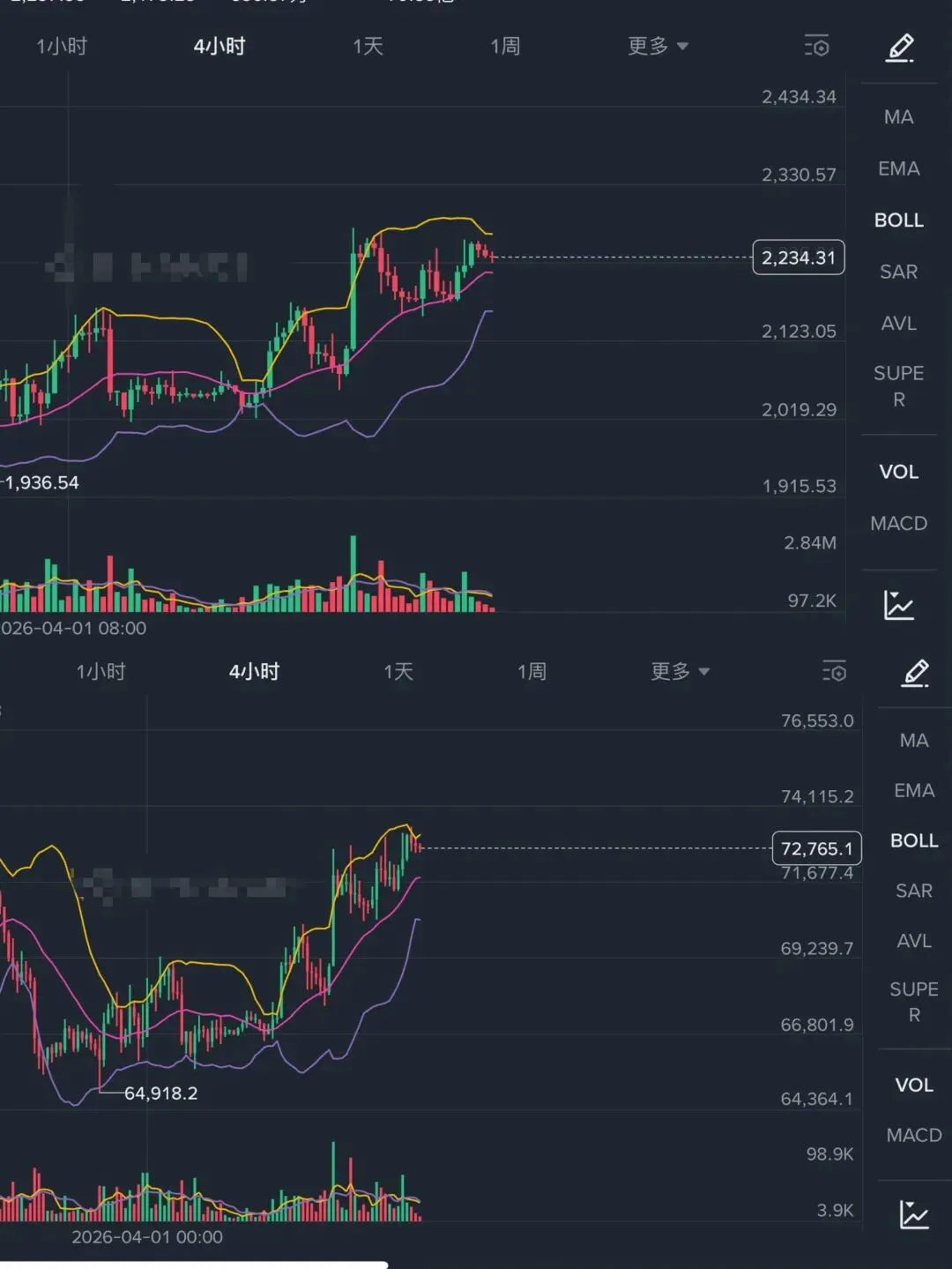 目前只要不跌破 70486,大方向就是涨。现在的小高点、低点都在往上抬,没出现更低的低点之前,坚决不做空。宁可错过回调