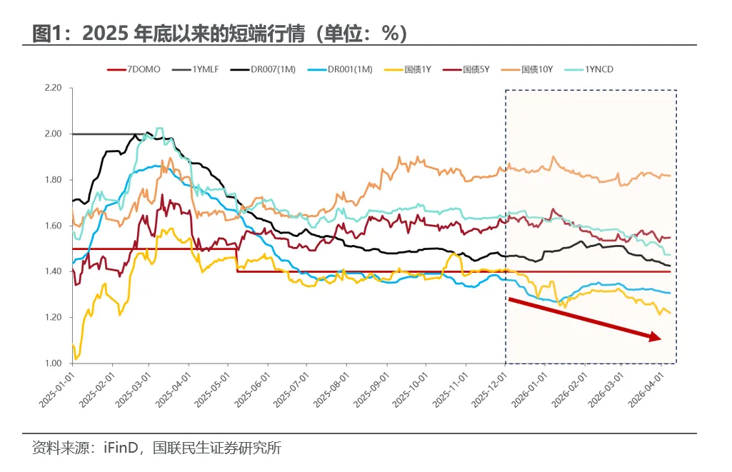 2025年12月至2026年4月7日,DR001(1M)下行6bp至1.31%、1Y国债下行19bp至1.22%、1YNCD下行18bp至1.47%,2026Q1货币政策委员会季度例会在货币政策定调中增加了“规范信贷市场经营行为,降低融资中间费用”的表述,暗示短期内政策重心或在于畅通利率传导机制,而非直接下调LPR,我们预计短期内下调政策利率的紧迫性或有所下降。值得关注的是,在短期内政策利率缺乏进一步下行动力的情况下,当前短端市场可能较为拥挤,潜在回调风险逐步累积,目前中端的5Y、7Y也跟随出现下行。在此背景下,我们试图通过复盘历史上短端债市行情结束的核心特征与驱动原因,梳理行情切换的关键信号,为本轮短债行情的后续演绎提供参考。通过复盘历史上六次典型的资金面宽松与短端利率大幅下行的阶段,我们发现:1.货币政策强宽松、资金利率快速下台阶时,短端利率的弹性往往明显大于长端;2.短端行情不一定需要资金利率的大幅下行,只要央行态度未发生明显改变,市场认为宽松可持续,短端债市收益率的下行幅度会明显大于资金利率;3.当资金价格明显偏离政策利率、银行体系流动性非常充裕时,1Y存单的弹性也会比较大。历次短端行情的结束,主要由三类力量触发:1. 央行对过低资金价格的纠偏,如2009年7月央行重启央票并主动引导利率上行、2015年6月央行公开市场操作连停、2025年一季度央行公开市场持续净回笼流动性,并暂停了国债买卖操作、多次释放稳汇率信号等;2.政府债供给冲击、融资需求或稳增长预期回升,导致资金面不再自发宽松,如2009年初“4万亿”投资计划带来的大量信贷投放效果显现、2020年6月政府债供给放量加速资金面收敛、2022年9月开始经济逐步企稳等;3. 前期杠杆与交易拥挤积累后,资金面一旦出现边际变化,短端利率往往面临较快调整,如2022年11月理财“赎回潮”导致负反馈短端利率开始加速上行、2025年一季度央行收紧流动性后短端利率快速反弹。因此,短端行情的结束方式大体分为温和型结束和冲击型结束两类,从历史分布来看,大多以温和型结束为主,会有低位震荡缓冲期或者在有宽松预期的情况下体现为调整幅度可控,冲击型结束(即“V型反转”)不是常态,往往发生在资金面极度宽松、短端拥挤、央行突然纠偏的情况下(如2015年6月-9月、2025年1-3月)。本次短债行情主要是自发宽松驱动而非货币政策强刺激推动,这意味着即使出现负carry,短端利率也仍有进一步下行的可能性,但下行空间并不大,我们认为后续短债行情更接近于温和型结束,即“低位横盘后,随央行持续回笼流动性和供给扰动小幅修正”,而不是立即演绎成“V型反转”。风险提示:经济表现波动超预期,财政与货币政策变化程度超预期。