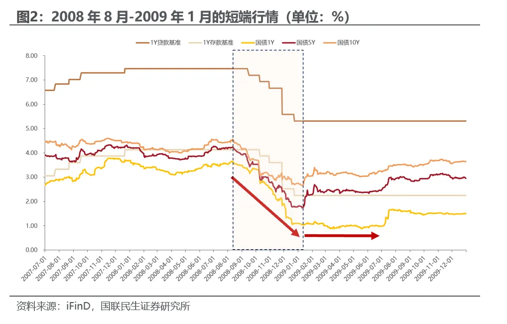 2008年8月-2009年1月:全球金融危机冲击导致我国经济增速骤降、通胀快速回落,央行货币政策“从紧”转为“适度宽松”,连续多次降准降息,资金面从偏紧转为极度充裕,此阶段债市利率全面下行,1Y国债下行258bp、5Y国债下行250bp、10Y国债下行184bp。进入2009年,“4万亿”投资计划带来的大量信贷投放效果显现,市场开始交易复苏预期,但直到2009年7月之前央行都没有回笼流动,资金面始终保持充裕,此时1Y国债收益率持续在0.85%-1.20%区间震荡。2009年7月央行重启央票并主动引导利率上行,1Y国债收益率从1%左右快速上行至1.65%左右。