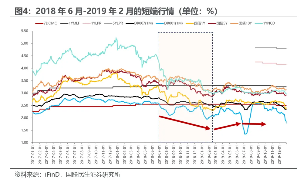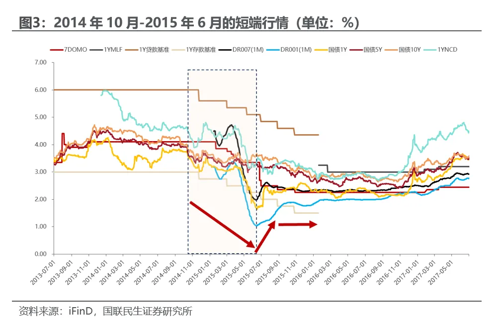 2014年10月-2015年6月:2014年开始经济出现下行压力,地产和工业走弱、PPI持续为负且进一步加深,央行多次降准降息提供支持,并创新使用MLF、PSL等工具投放流动性,虽然面临权益上涨和置换债供给分流债市资金,但资金面始终保持充裕,此阶段债市利率全面下行,1Y国债下行208bp、5Y国债下行61bp、10Y国债下行39bp、1YNCD下行118bp。2015年6月开始,第二批置换债渐进且央行公开市场操作连停,导致资金面收紧,DR001(1M)从1%出头逐步上行至2015年10月的接近1.90%,1Y国债在2015年7月一个月内出现80bp的调整。2018年6月-2019年2月:中美贸易摩擦升级导致出口下滑、企业信心受挫,信用收缩、经济走弱,货币政策转向稳增长,通过多次降准推动资金面明显转松,此阶段短端行情不是政策利率快速大幅下调主导,而是“降准释放流动性推动资金利率下行+融资需求低迷+贸易摩擦不确定性压制股市资金流入债市”的综合影响,DR001(1M)下行53bp、1Y国债下行91bp、5Y国债下行53bp、10Y国债下行44bp、1YNCD下行155bp。2019年2月20日国常会上指出,“降准信号发出后,社会融资总规模上升幅度表面看比较大,但仔细分析就会发现,其中主要是票据融资、短期贷款上升比较快。这不仅有可能造成‘套利’和资金‘空转’等行为,而且可能会带来新的潜在风险“,随后资金利率开始趋紧,DR001(1M)在2019年2-3月上行接近40bp、1Y国债在2019年2-4月调整接近40bp后窄幅波动。