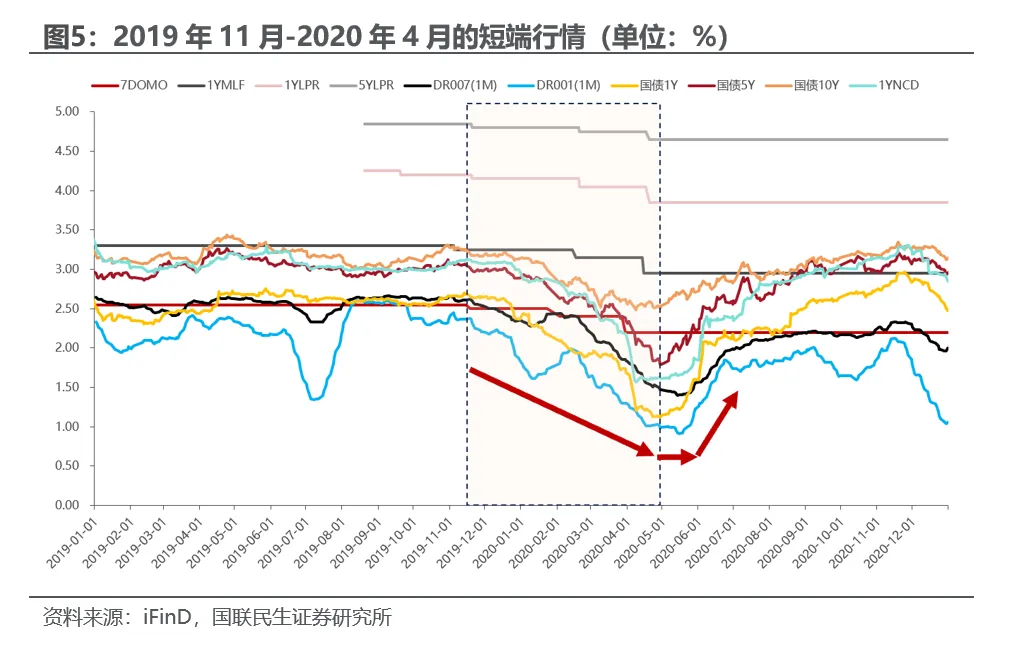 2019年11月-2020年4月:2019年四季度GDP同比进一步小幅放缓,2020年初公共卫生事件来袭导致经济停摆,货币政策“量价齐松”,通过公开市场大幅净投放、降准降息、再贷款再贴现等共同推动资金利率走低,此阶段DR001(1M)下行135bp、1Y国债下行157bp、5Y国债下行122bp、10Y国债下行73bp、1YNCD下行150bp。随着国内公共卫生事件好转,经济逐步重启,2020年4月公布的3月社融数据超出市场预期,宽信用预期升温,而后货币政策逐步正常化,4月至5月25日央行一直未操作逆回购,资金利率持续低位震荡,后续随着政府债供给放量,才加速资金面收敛,DR001(1M)在一个月上行接近90bp、1Y国债在一个月上行85bp左右。