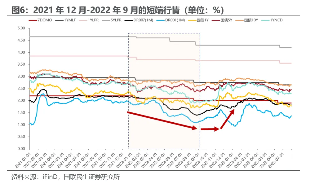 2021年12月-2022年9月:受公共卫生事件反复冲击消费、生产以及恒大等房企违约引发信用风险,经济下行压力加大,在美联储加息的情况下我国央行“以我为主”,降准降息支持流动性持续宽松,但实体融资需求不足,资金淤积在金融体系,此阶段DR001(1M)下行82bp、1Y国债下行65bp、5Y国债下行32bp、10Y国债下行22bp、1YNCD下行81bp。从2022年9月开始,随着经济逐步企稳、财政资金加快使用、信贷有所修复,央行兼顾内外均衡,灵活操作公开市场,资金面转为均衡中性,推动资金利率逐步向政策利率靠拢,DR001(1M)在2022年9-10月上行45bp左右、1Y国债在1.75%-1.85%区间震荡,直到2022年11月理财赎回潮导致负反馈才开始加速上行。