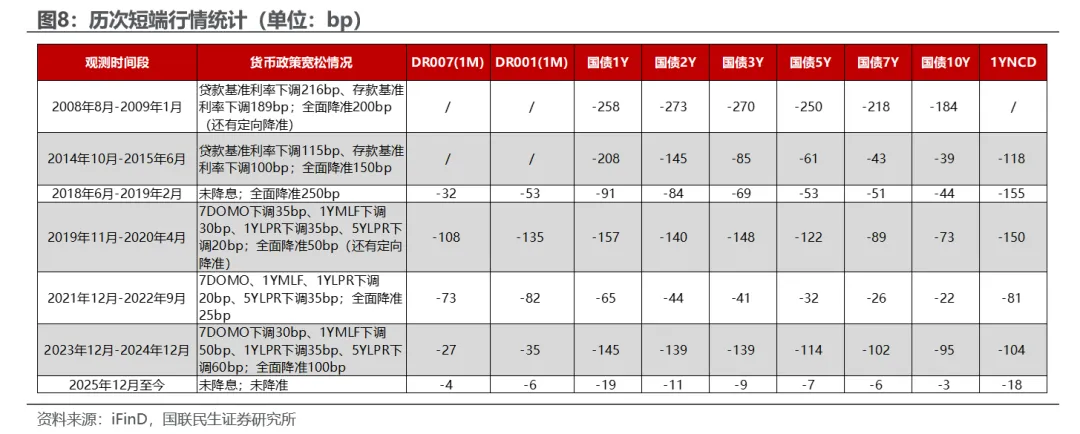 历史上典型的资金面宽松与短端利率大幅下行的阶段有6个,分别是2008年8月-2009年1月、2014年10月-2015年6月、2018年6月-2019年2月、2019年11月-2020年4月、2021年12月-2022年9月、2023年12月-2024年12月。