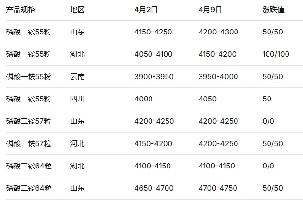 国内磷铵市场价格周度涨跌表