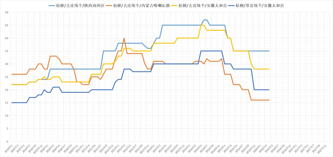 产地货源充裕,近期虽有商家关注,但多以询价为主,货源实际成交量不大,持货商家出售愿意不一,现去尾去皮选条个子38-40元,统货23-25元,药厂货小条16-18元。