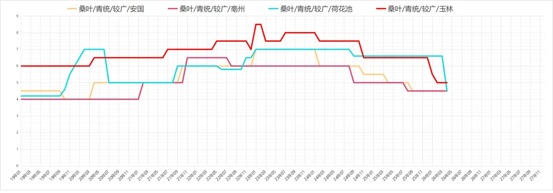 桑叶行情略显疲软,近日市场商家关注力度一般,市场及产地可供货源量充足,且产量相对稳定,货源走销一般,商家多采取勤进快销的经营方式 ,现统货价格在3元左右。