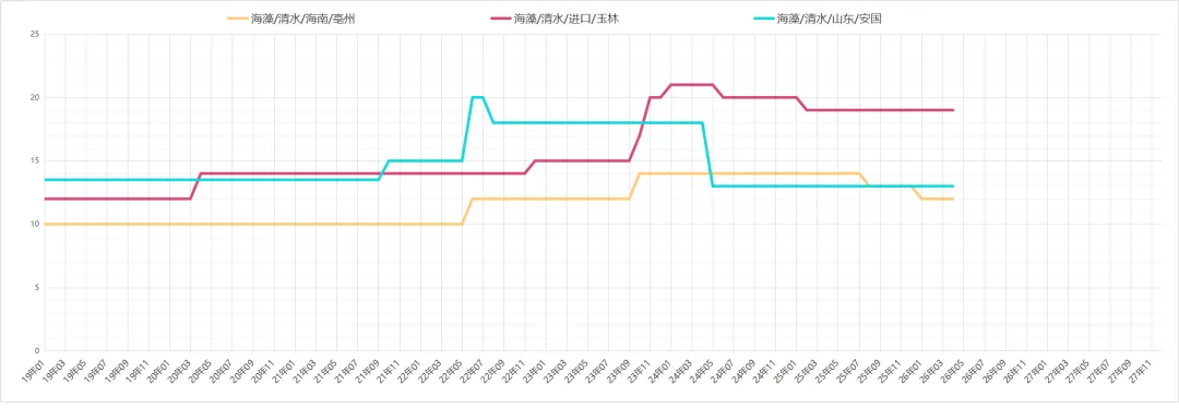 海藻价格较前期保持平稳,当前市场寻货商家较少,货源走销以按需采购为主,现浙江小叶货价格在13元左右。