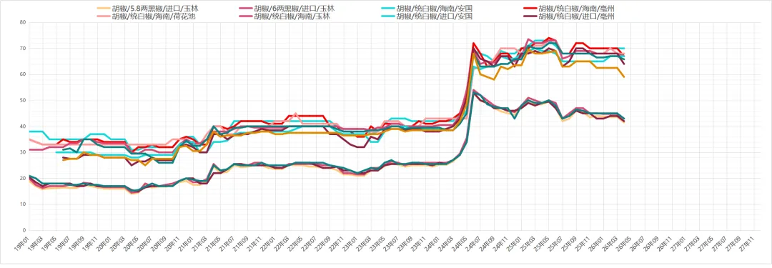 白胡椒价格无明显波动,近期市场商家关注力度一般,因缺乏实际需求拉动,货源走销不快,现进口货价格在60-65元,短期内价格波动可能性较小。
