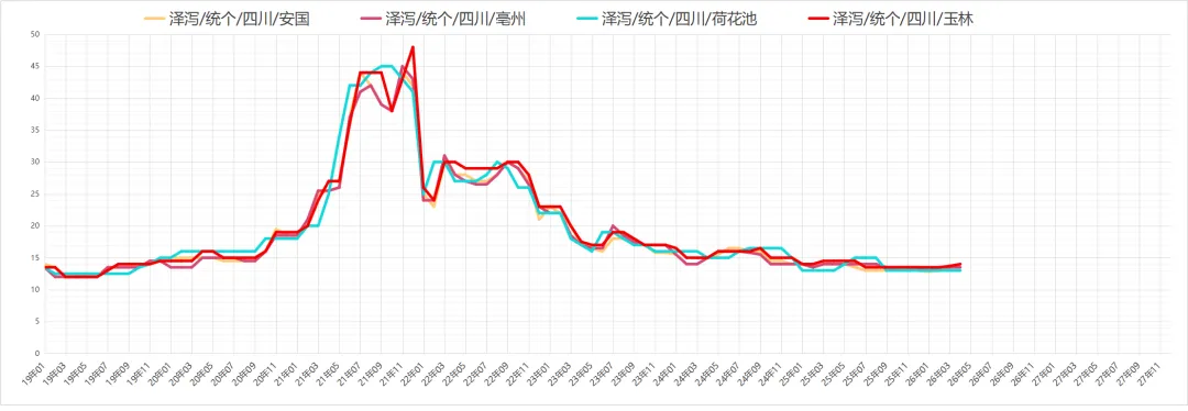 千里香价格进一步回落,受部分商户急于变现,低价出售影响,市场价格进一步承压,行情小幅回落,现市场价格在14元左右。