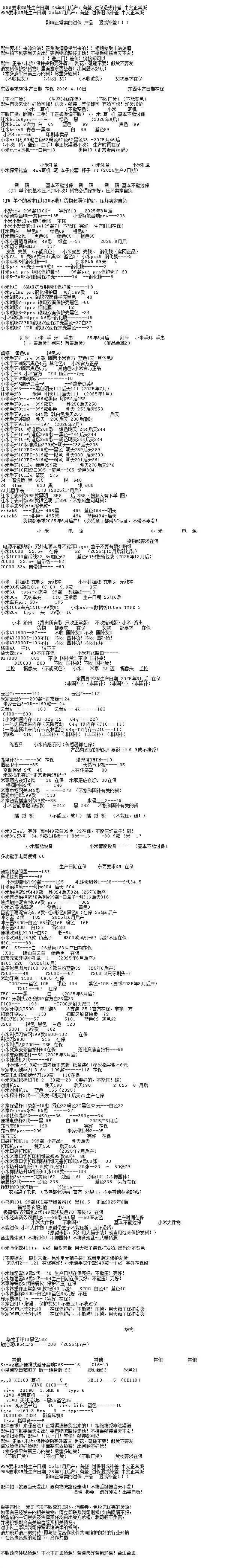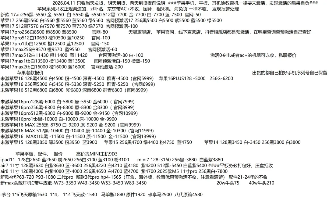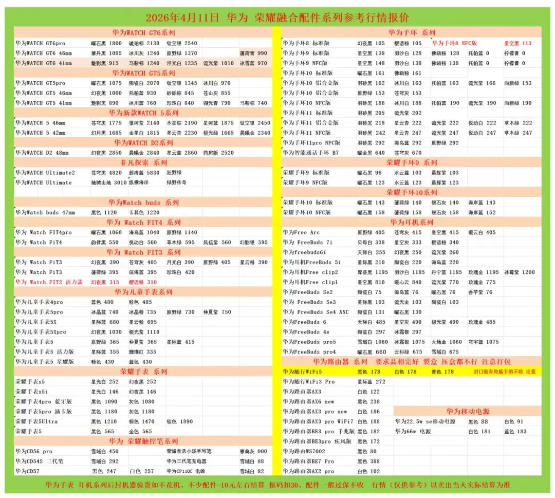 任天堂游戏机: 新款二代NS2港版标配机:3340 新款二代NS2港版马车机:3610,没游戏码:3320(注意下单要看有没有游戏码的 要不然就是便宜的) 新款二代NS2新加坡版 台版 单机:3245,就是没有游戏的 新款二代NS2韩版 欧版 美版 单机:3210,就是没有游戏的 新款二代NS2新加坡版同捆:3560,没游戏码:3210 NS2港版宝可梦同捆:3610 OLED屏 日版白-25年生产日期1820,非25年-30 彩色-1945 OLED屏 港版白-1760 彩色-1830 OLED屏 国行白-1645 彩色-1645 OLED屏 朱紫港版-1890 日版-1890 OLED屏 喷射港版-1890 日版-1890 健身环国行-125 海外版-325 LITE日版 港版 蓝:1015,黑粉1015,绿黄1015 任天堂日版闹钟:475 任天堂闲聊花:165 注意区分,这些就不是oled屏的 价格以下(续航版) NS续航国彩-1420 黑-1300,拆封-50 NS续航日彩-1540 黑-1460 长款-30 索尼PS5游戏机 (PS5都要留好纸箱带来,以免破坏品相) 2024新款:PS5 PRO日数:5710 2024新款:PS5 PRO港数:5910 2025新款:PS5 PRO国数:5660 2023新款ps5 日版光驱Slim:3660 2023新款ps5 日版数字Slim:3100 2023新款ps5 国行光驱Slim:老款:3490,2025新款3520 2023新款ps5 国行数字Slim:3100 2023新款ps5 港版光驱Slim:3660 2023新款ps5 港版数字Slim:3100 PS5国行手柄普通色:370,珠白靛青凫绿385,外版-30 PSP串流机:1400白,1400黑 PS5单国光驱:545,外版505 ROG XBOX :6730 OLED SteamDeck掌机掌上游戏机 512G 美:4680,日港:4680 OLED SteamDeck掌机掌上游戏机 1TB 美:5300,日港:5300 大疆3标准:,全能: 大疆Action4标准:,全能: 大疆ACT5 Pro标准:,全能: 大疆action5pro畅拍: 大疆AC6标准: 大疆AC6畅拍: 大疆NEO标配:,全能: 大疆OM7P:,om7: 大疆 mic1拖1:,1拖2: o4图传: 拍立得MINI12影像花室套装:,外版,一次成像礼盒装 拍立得SE国行:,白色: 拍立得相纸20张:129.5,10张:64.5 拍立得锡纸装10张:62.5 任天堂 手柄 NS左右手柄:345 NS2左右手柄:385 NS2 PRO 黑柄:395 PRO国黑柄:295,外版280只收跨境 PRO乱斗柄:330只收跨境 PRO王泪柄:330只收跨境 PRO喷射柄:330只收跨境 PRO异度柄:330只收跨境 4月11价格更新 行情参考 大疆pk3标准代卖 大疆pk3全能代卖 大疆ac4标准1225 大疆ac5标准1980 大疆ac5畅拍2500 大疆ac6标准2650 大疆ac6畅拍3250 大疆nano 64 :1750 大疆nano128:2030 大疆o4pro图传代卖(26年一月份的不要) mini一拖一 手机版 175 mini一拖二 手机版 245 mini一拖二 470 【大疆系列只收待更新状态的机器 后封/在保代卖或扣款】 影石acepro一代1370 影石go3s 64 黑白1450 影石go3s 128 黑白1650 影石acepro2单电黑2330 影石acepro2单电白2400 影石acepro2双电黑2410 影石acepro2玩拍套装3500 影石x5标准黑2590 影石x5全能3100 影石go ultra黑2010白2030 影石go ultra人气套装黑2150白2170 影石aceproPro2 街拍黑 270银 275 影石128内存卡170 遮光罩65 影石114自拍杆60 影石迷你自拍杆一代45 影石迷你自拍杆二代65 华为手表目前行情参考 华为 Watch FiT4 黑555白565绿600紫565银600 华为 Watch FIT4 pro 黑1070蓝1050绿1150 华为WATCH FIT 3 黑395灰410月光白395原野绿410粉395薄荷绿400蓝400珍珠白425 华为WATCH FIT 2活力款 黑色320粉315 Watch D2 黑 2860白2850蓝2870 药房版 2530 Watch buds 黑1130卡其色 1230 Watch 5 46m 黑1785紫2150棕 2200蓝1885钛空银 2460 Watch 5 42m 黑1695白1825杏2240绿1675金2350 非凡2 黑4850蓝5850 非凡手表 黑3030 华为新款WATCH GT6系列 GT6 pro 黑1810棕2140钢2550 GT6 46m黑 1095灰色 1250绿色 1380 GT6 41m 黑 925棕色 1250白色 1245紫色1020蓝980青1000 华为新款WATCH GT5系列 GT5 46黑1010蓝940棕855灰865 GT5 41 黑 900蓝770白850青800棕750 GT5pro 黑1085陶瓷2080钛钢色 1355冰川白980 华为儿童手表系列 儿童4pro蓝485粉490 儿童5pro 蓝750粉745绿740紫760 儿童5X 蓝690粉705 儿童5Xpro 黑1040紫1120 儿童5 绿370紫370蓝420活力蓝360红340 儿童5星耀 粉435蓝435 荣耀,华为手环 荣耀手环9标准黑98蓝105紫105 荣耀手环9NFC 黑125蓝125紫125 荣耀手环10标准黑145绿143灰143蓝145 荣耀手环10NFC 黑160灰160绿160蓝155 华为手环系列 华为手环8标准黑108粉110 华为手环8NFC 黑115 华为手环9 黑140白130粉130 华为手环9nfc版 黑150白140粉140 华为手环10标准 黑163粉163 华为手环10铝合金款 黑164白165蓝165紫168向新绿155原野绿155灰155 华为手环10NFC 黑188白190蓝192紫192绿192 华为手环11 标准版 羽砂黑 208流光紫 205 华为手环11 铝合金版 羽砂黑 220星云杏225流光紫225悦动白225草木绿 225 华为手环11 NFC版 羽砂黑 245星云杏 250流光紫 250悦动白 250草木绿250 华为手环11pro NFC版 羽砂黑 295海岛蓝295原野绿295 B7 黑650灰670 华为耳机系列 华为Free Arc 绿410灰420黑420白410 华为 FreeBuds 7i 白342灰337粉345 华为freebuds6i耳机 白258黑253紫263 华为耳机Free clip2 黑1205白1195蓝1195金1205紫1210 华为耳机Free clip 黑色820暖星云850紫 780玫瑰金785 华为耳机FreeBuds 5i 黑213白223蓝223 华为FreeBuds se2 耳机 白77蓝78黑78紫78 华为 FreeBuds se3 黑105金105白105 华为 FreeBuds Se4 白133黑132 FreeBuds 6 白490黑495紫495金490 FreeBuds 4e 2024款 白300银300 FreeBuds pro5 白1070银1085金1070蓝1085 FreeBuds pro4 黑670绿685白685 华为CD56 pro笔 455 华为CD57 黑250白260 华为CD54S 三代笔295 华为 三代笔充电器 90 Wifi5 黑180白180青180 WiFi3 pro 275 AX3 124 AX6 new 242 AX3 pro new 190 AX3 pro WiFi7 192 BE3pro 千兆版 185 BE3pro 疾风版 175 BE7pro 393 AX2pro 105 荣耀手表 荣耀手表x5 白255黑255 荣耀手表x5i 白148黑148 荣耀手表5pro 蓝牙版黑1100灰1090 荣耀手表5pro 插卡版黑1190灰1190 荣耀手表5Ultra黑1220棕1480钛金属1900 荣耀手表5 黑570金570 移动电源 华为22.5w se 移动电源 黑90白93 华为66w 电源 白183蓝185 |