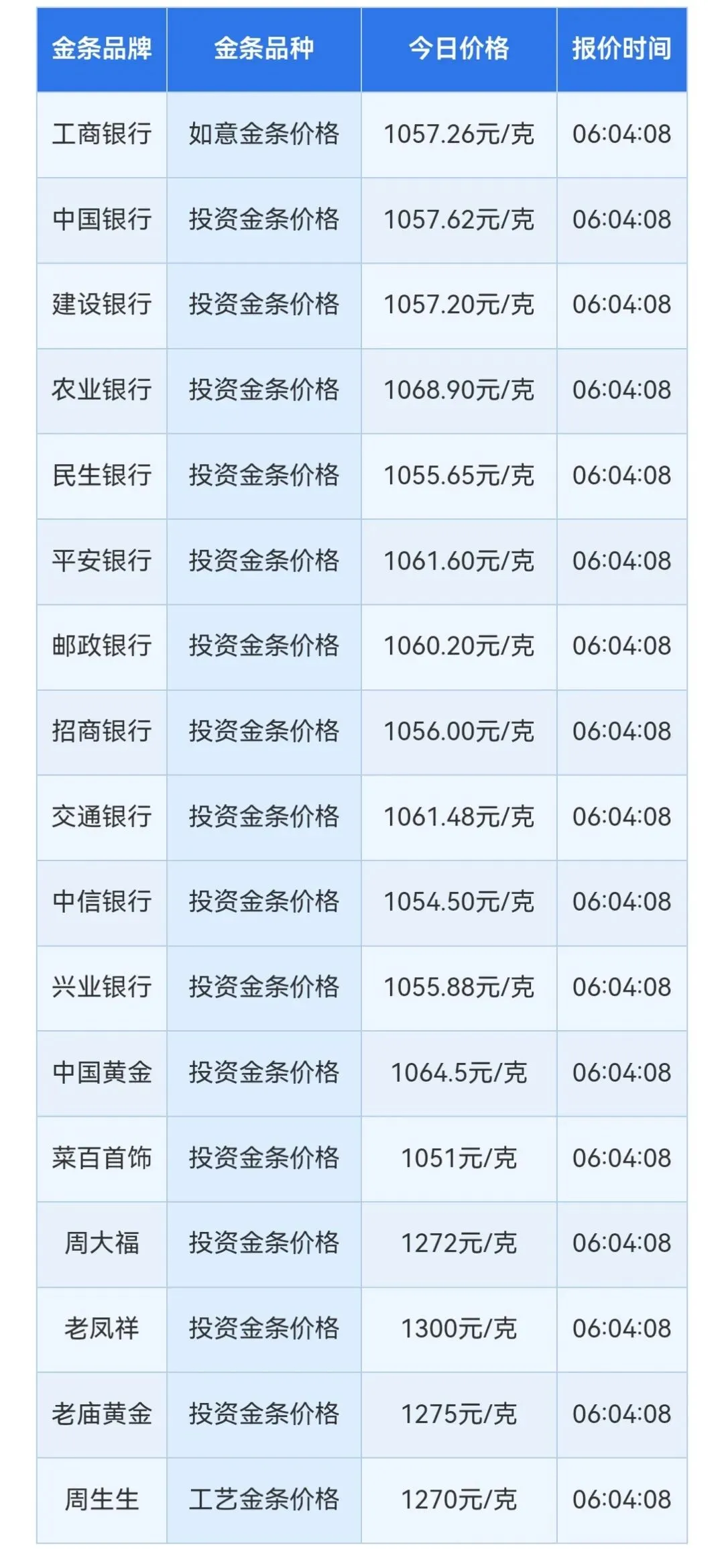 金条价格:银行投资金条同步回调,工行如意金条1057.26元/克,建行1057.19元/克,中行1057元/克,较昨日均有1.5%-2.7%跌幅。