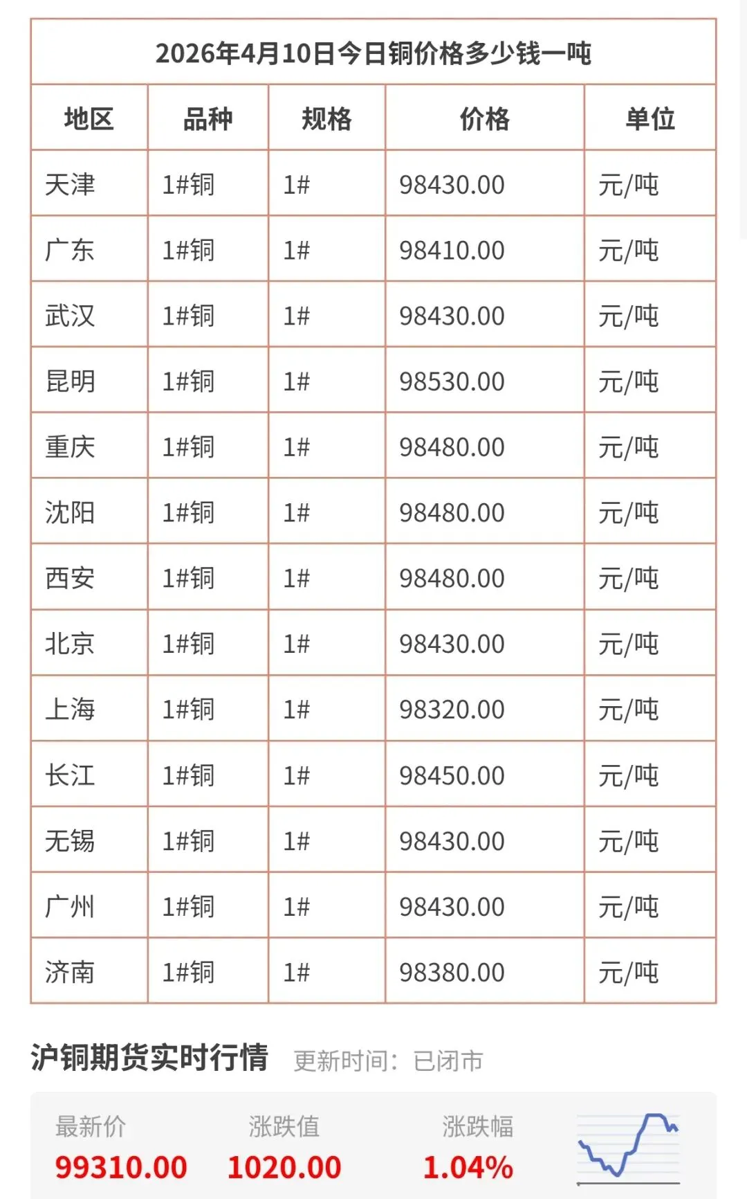 4月11日更新,今天铜价实时查询!最新今日铜价格多少钱一吨,包括广东、武汉、昆明、西安、无锡、天津等地区现货铜价格